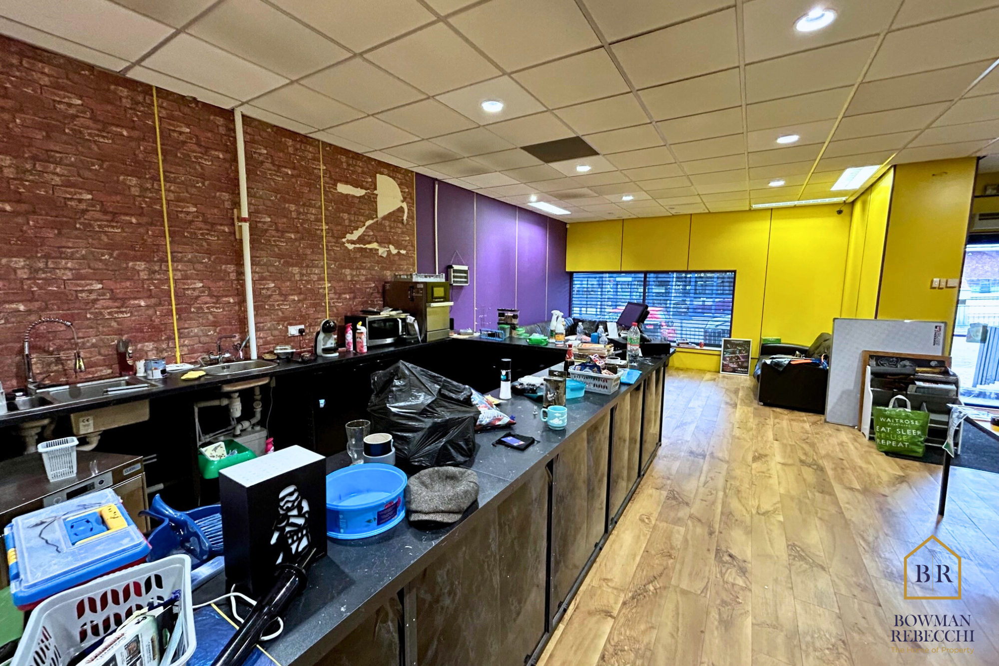 Previously the Geek Retreat, the property provides a large open plan main floor which has been decorated to a high standard, with a large counter to the right hand side.