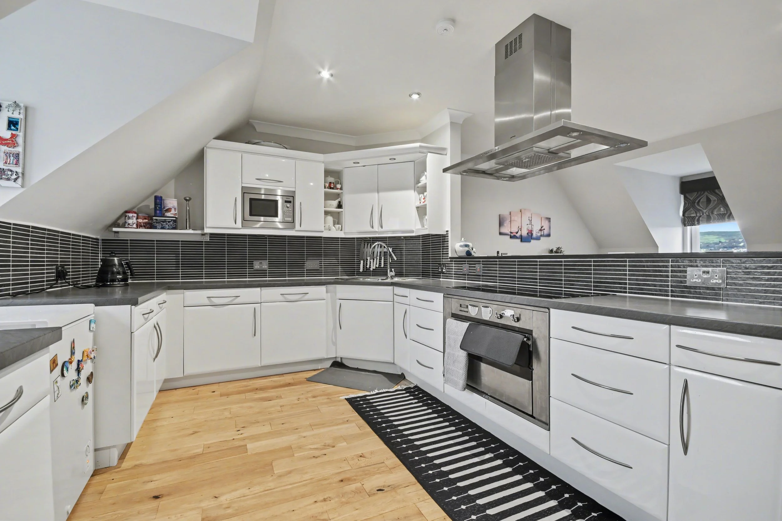 The apartment is beautifully presented throughout and thoughtfully designed to maximise natural light and outlook. A welcoming and generous reception hallway leads to a stunning lounge, where floor-to-ceiling glazing draws the eye towards panoramic views across Kip Marina. From here, doors open onto a spacious private balcony, the perfect vantage point for morning coffee, sunset views or entertaining against a dramatic coastal backdrop.